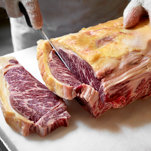 Kött på ben, biff, entrecote, rostbiff och högrev hängmörar vi gärna. I vårt mognadsrum skapas en unik husarom med toner av hasselnöt, anklever och blåmögelost. Du kan också välja att möra samma styckdetaljer liggande mot en saltvägg. Det köttet kallar vi för Dry Age. Köttet ger en annan typ av mörning men med samma arom som det hängmörade köttet.